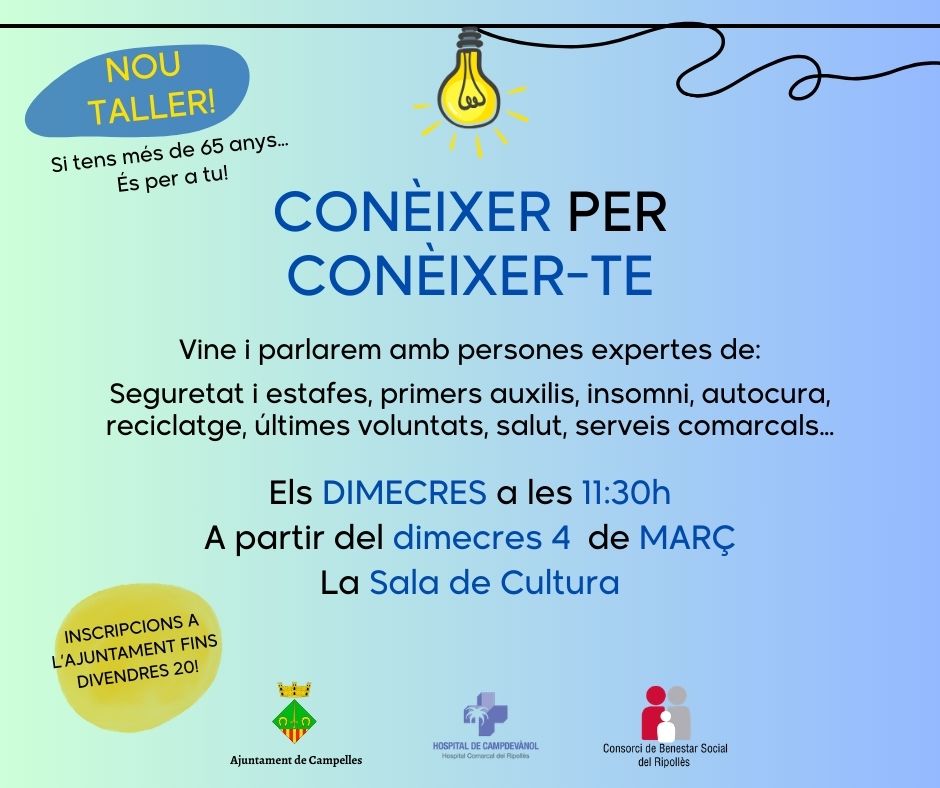 Taller adreçat a persones majors de 65 anys que volen informar-se, cuidar-se i conèixer els recursos i serveis que tenen al seu abast.