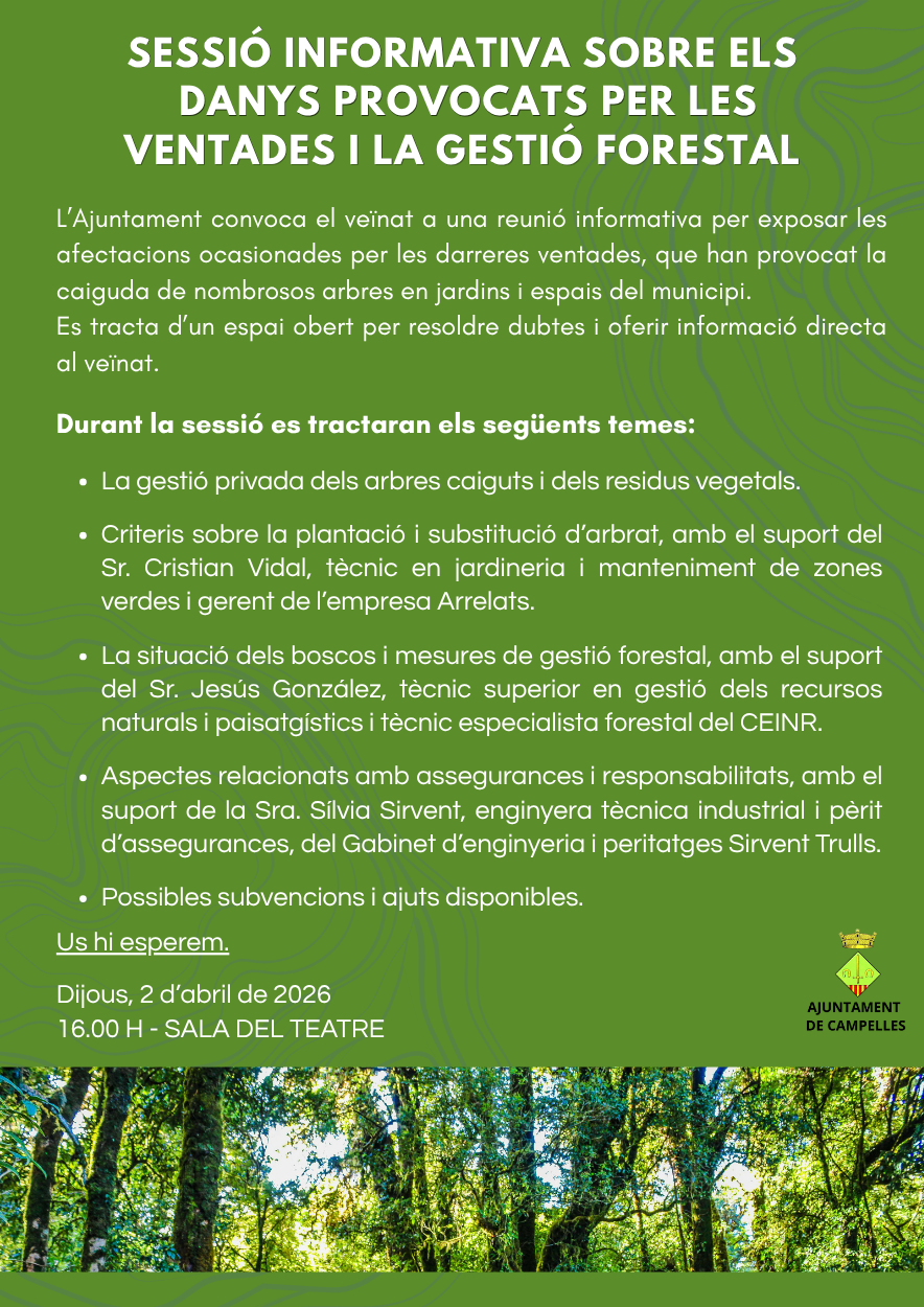 L’Ajuntament convoca el veïnat a una reunió informativa per exposar les afectacions ocasionades per les darreres ventades, que han provocat la caiguda de nombrosos arbres en jardins i espais del municipi. Es tracta d’un espai obert per resoldre dubtes i oferir informació directa al veïnat. Durant la sessió es tractaran els següents temes: La gestió […]