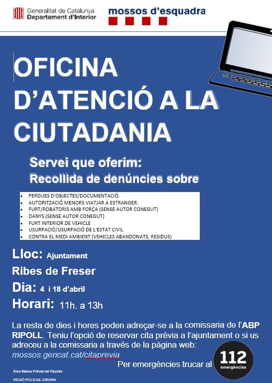 ℹ️ Nou servei de Mossos d’Esquadra per apropar l’atenció ciutadana. 📢 OFICINA D’ATENCIÓ A LA CIUTADANIA – MOSSOS D’ESQUADRA L’Oficina d’Atenció Ciutadana – Mossos d’Esquadra ens informa del pròxim servei: 📍 Lloc: Ajuntament de Ribes de Freser 📅 Dies: 4 i 18 d’abril 🕚 Horari: de 11 h a 13 h 🔹 Serveis que s’ofereixen (recollida […]