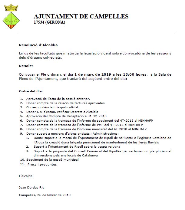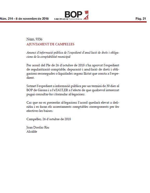 General BOP 214 Anunci d’informació pública de l’expedient d’anul·lació de drets i obligacions de la comptabilitat municipal Veure anunci 08/11/2018