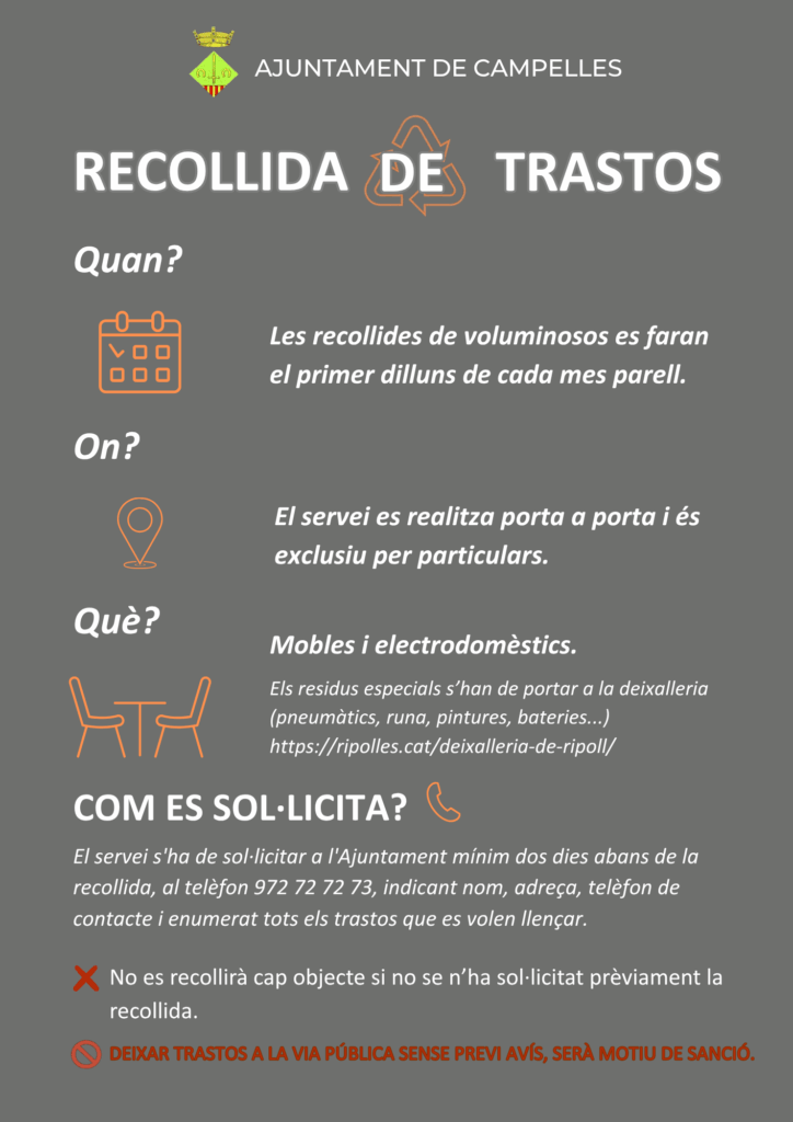 📞 El servei de recollida s’ha de sol·licitar a l’Ajuntament abans del divendres abans, a les 13h al telèfon 972 72 72 73 indicant nom, adreça, telèfon de contacte i enumerar tots els trastos que volen llençar.