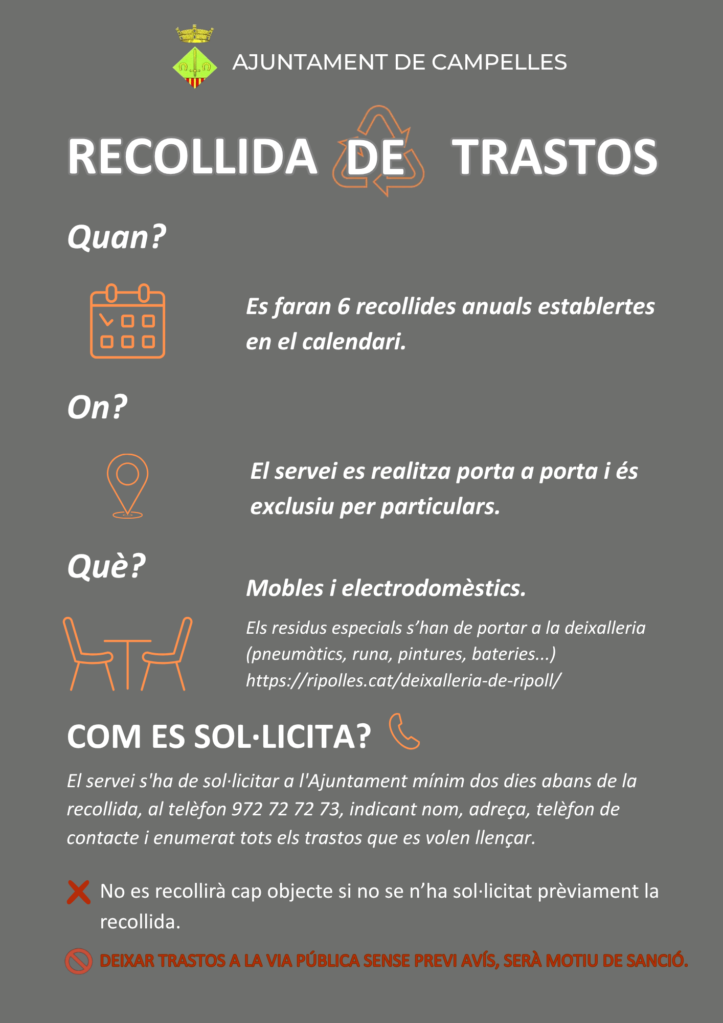 📞 El servei de recollida s’ha de sol·licitar a l’Ajuntament abans de les 13:00 del divendres anterior, al telèfon 972 72 72 73, indicant el nom i cognoms, l’adreça, el telèfon de contacte i detallant tots els trastos que es volen llençar.